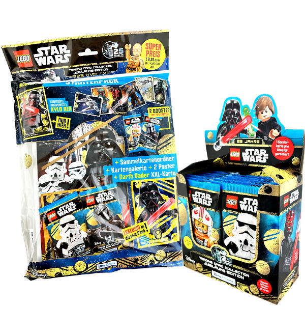 Starterpack + Display zum Lego Star Wars Serie 5 "Jubiläums-Edition - 25 Years of LEGO Star Wars" Trading Card Game mit insgesamt folgendem Inhalt: