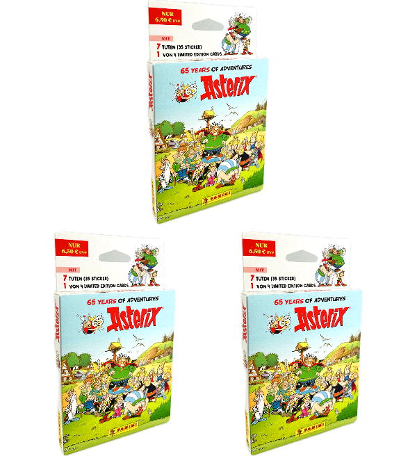 3 x Eco-Blister (=21 Tüten + 3 Limited Edition Cards) aus der "Panini Asterix 65 Jahre Abenteuer" Sticker-Kollektion. Jede Tüte enthält 5 Sammelbilder.