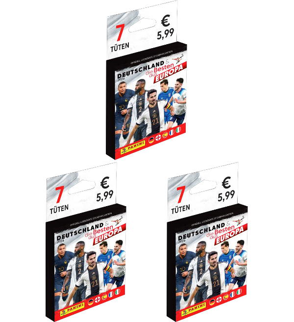 3 Eco-Blister (=21 Tüten) aus der Panini Deutschland & die Besten aus Europa 2024 Sticker-Kollektion. Jede Tüte enthält 6 Sammelbilder.