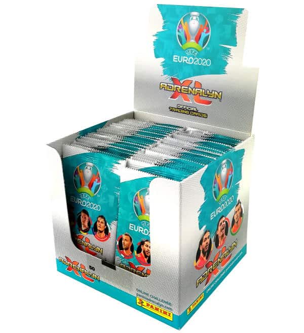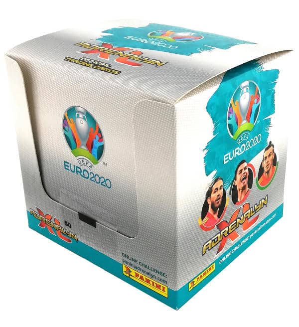 Ein original verpacktes, ungeöffnetes Display mit 50 Tüten der Panini EURO 2020 Adrenalyn XL Trading Card Serie. Jede Tüte enthält 8 Karten, so dass in der Box insgesamt 400 Cards enthalten sind.