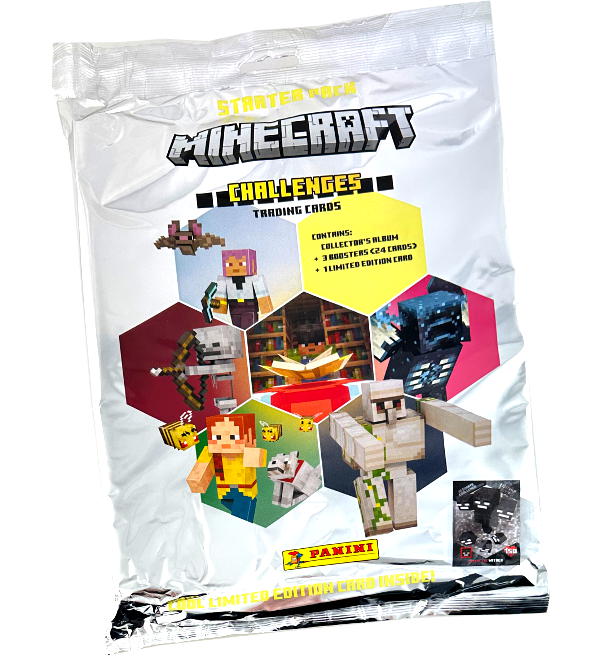 Starter-Pack zur "Panini Minecraft 4 CHALLENGES" Trading Card Serie (2025) mit insgesamt folgendem Inhalt: