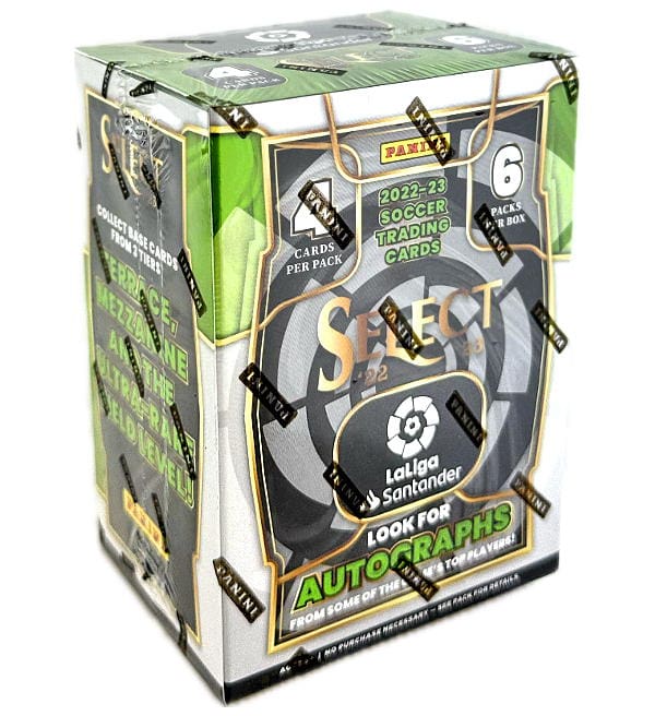 Blaster Box mit 6 Booster Packs zur "Panini Select LaLiga 2022/23" Trading Card Kollektion. Jeder Booster enthält 4 Karten, somit sind in der Box insgesamt 24 Cards enthalten.