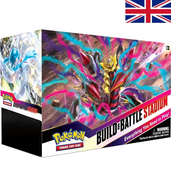 Die Build & Battle Stadium Box (Englisch) zum Erweiterungs-Set "Sword & Shield 11 - Lost Origin" des Pokémon-Sammelkartenspiels mit folgendem Inhalt: