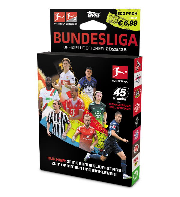 Eco Pack (=6 Tüten + 3 Holo Sticker) der Topps Bundesliga 2025/2026 Sticker-Kollektion. Jede Tüte enthält 7 Sammelbilder.