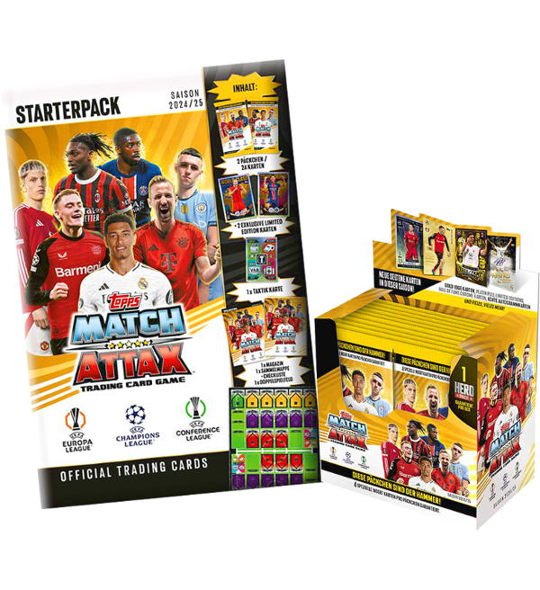 Starterpack + Display mit 24 Tüten zur Topps UCC Champions League 2024/25 Match Attax Trading Card Serie mit folgendem Inhalt: