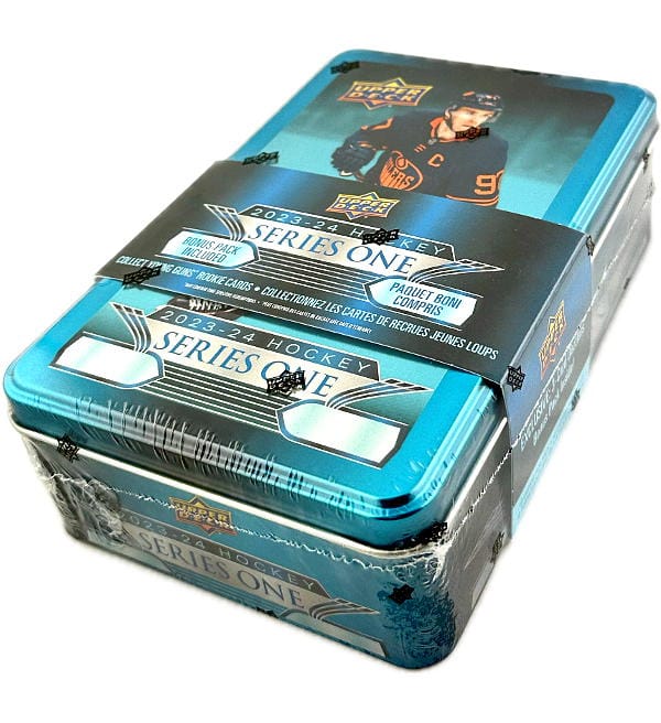 Tin Box mit 8 Tüten (=64 Cards) + 1 Bonus Pack (3 Dazzlers Cards) aus der "Upper Deck NHL 2023-24 Hockey - Series One" Trading Card Kollektion.